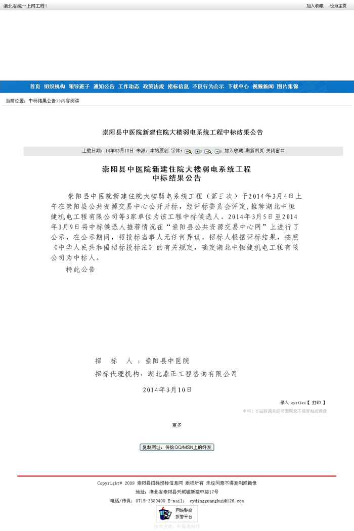 崇陽縣中醫(yī)院新建住院大樓弱電系統(tǒng)工程中標結果公告