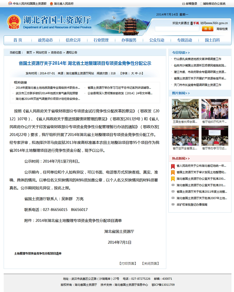 省國(guó)土資源廳關(guān)于2014年 湖北省土地整理項(xiàng)目專項(xiàng)資金競(jìng)爭(zhēng)性分配公示