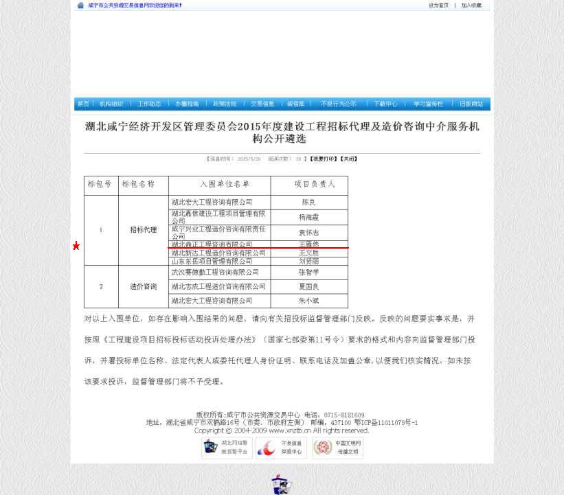 【經(jīng)營成果】我司入圍湖北咸寧經(jīng)濟開發(fā)區(qū)管理委員會2015年度建設工程招標代理及造價咨詢中介服務機構庫招標代理單位