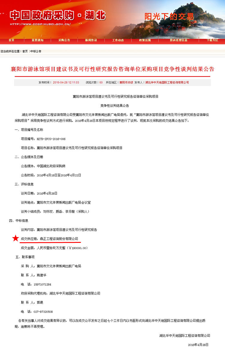 【經(jīng)營成果】我司中標襄陽市游泳館項目建議書及可行性研究報告咨詢單位采購項目
