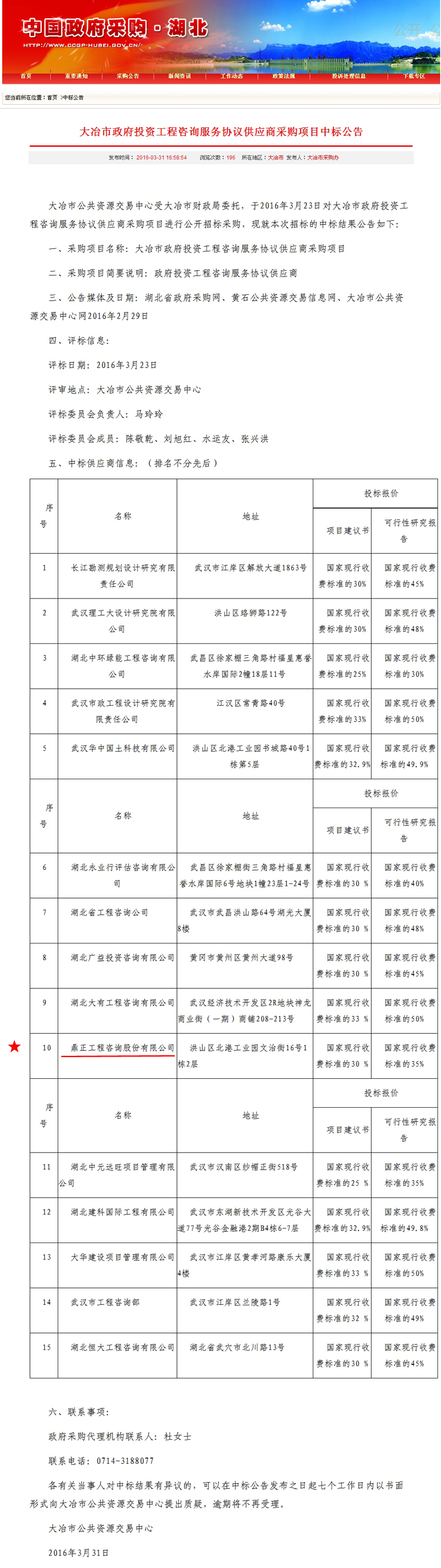 【經(jīng)營(yíng)成果】我司中標(biāo)大冶市政府投資工程咨詢服務(wù)協(xié)議供應(yīng)商采購(gòu)項(xiàng)目