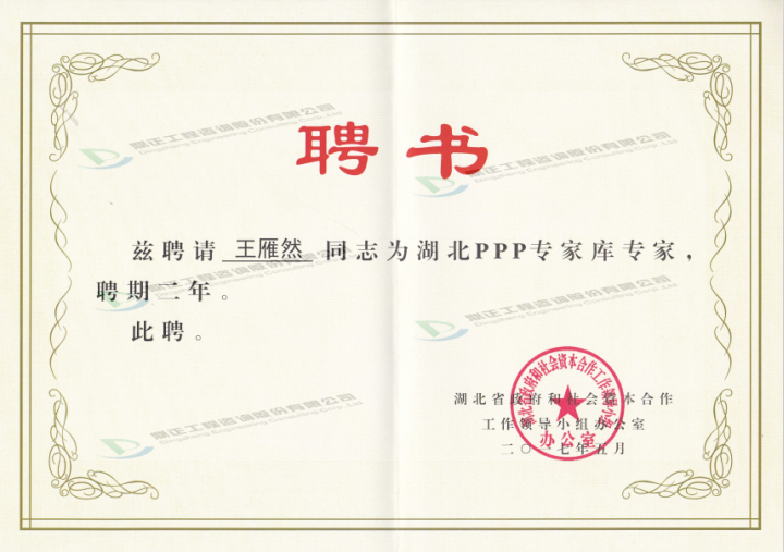 ,我司王雁然先生、朱立冬教授、張宏亮先生已入選湖北省財政廳PPP專家?guī)鞂<遥硗?,王雁然先生還被崇陽縣人民政府聘為崇陽縣PPP項目專家顧問。