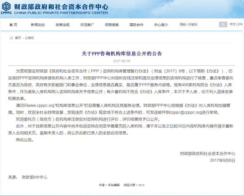 2017年9月8日,財(cái)政部PPP中心發(fā)布了《關(guān)于PPP咨詢機(jī)構(gòu)庫信息公開的公告》,406家機(jī)構(gòu)符合《政府和社會(huì)資本合作(PPP)咨詢機(jī)構(gòu)庫管理暫行辦法》(財(cái)金【2017】8號(hào))入庫條件,鼎正公司成功入選財(cái)政部首批PPP咨詢機(jī)構(gòu)庫。