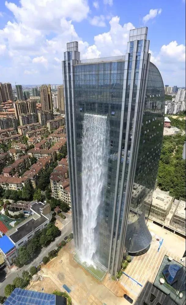 遠(yuǎn)遠(yuǎn)望去,噴水的大廈像是懸掛一片白練,足足有100多米高,走進(jìn)一看,原來(lái)是真的瀑布。