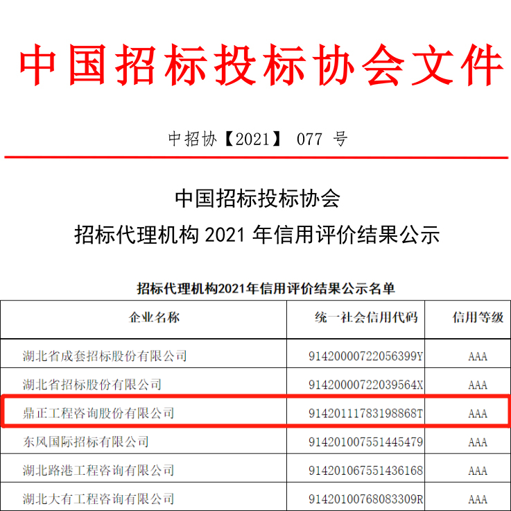 近日,中國招標(biāo)投標(biāo)協(xié)會頒布了招標(biāo)代理機(jī)構(gòu)2021年信用評價結(jié)果公示,鼎正工程咨詢股份有限公司繼獲得2021年度工程造價咨詢企業(yè)AAA信用評級后,再榮獲招標(biāo)代理機(jī)構(gòu)AAA信用評級!