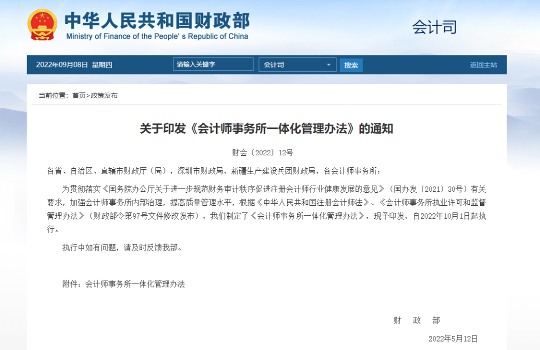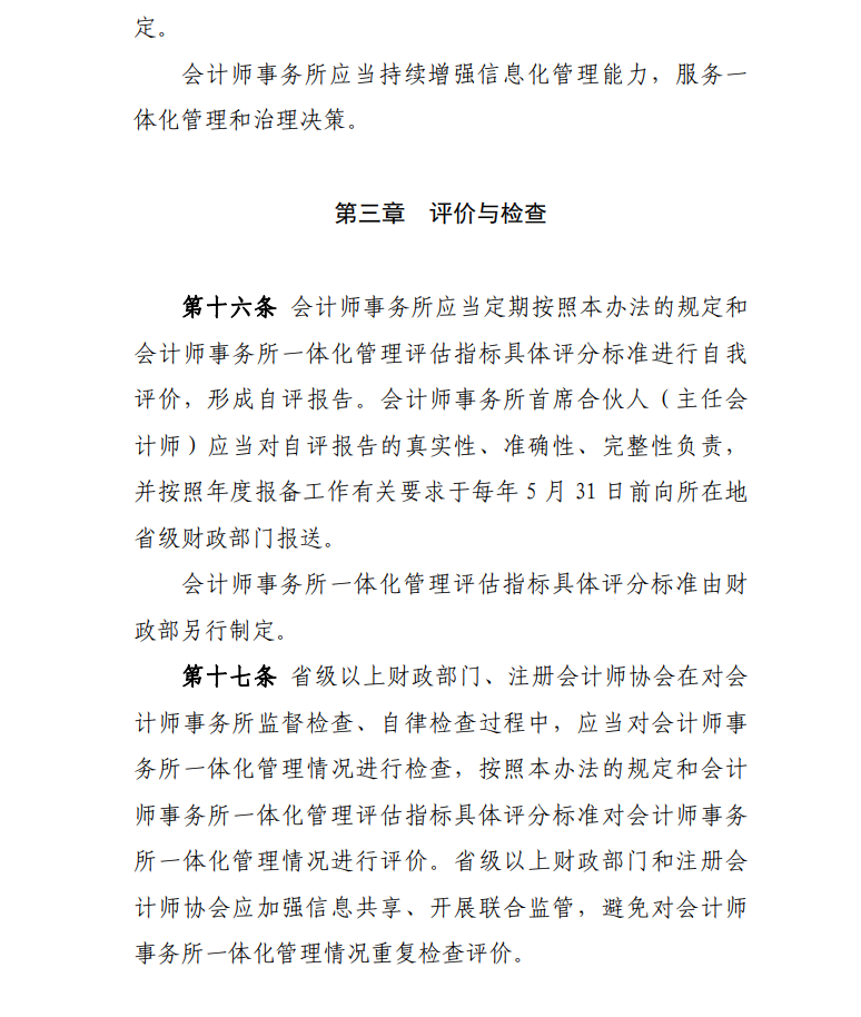 為貫徹落實《國務(wù)院辦公廳關(guān)于進(jìn)一步規(guī)范財務(wù)審計秩序促進(jìn)注冊會計師行業(yè)健康發(fā)展的意見》(國辦發(fā)〔2021〕30號)有關(guān)要求,加強(qiáng)會計師事務(wù)所內(nèi)部治理,提高質(zhì)量管理水平,根據(jù)《中華人民共和國注冊會計師法》、《會計師事務(wù)所執(zhí)業(yè)許可和監(jiān)督管理辦法》(財政部令第97號文件修改發(fā)布),我們制定了《會計師事務(wù)所一體化管理辦法》,現(xiàn)予印發(fā),自2022年10月1日起執(zhí)行。