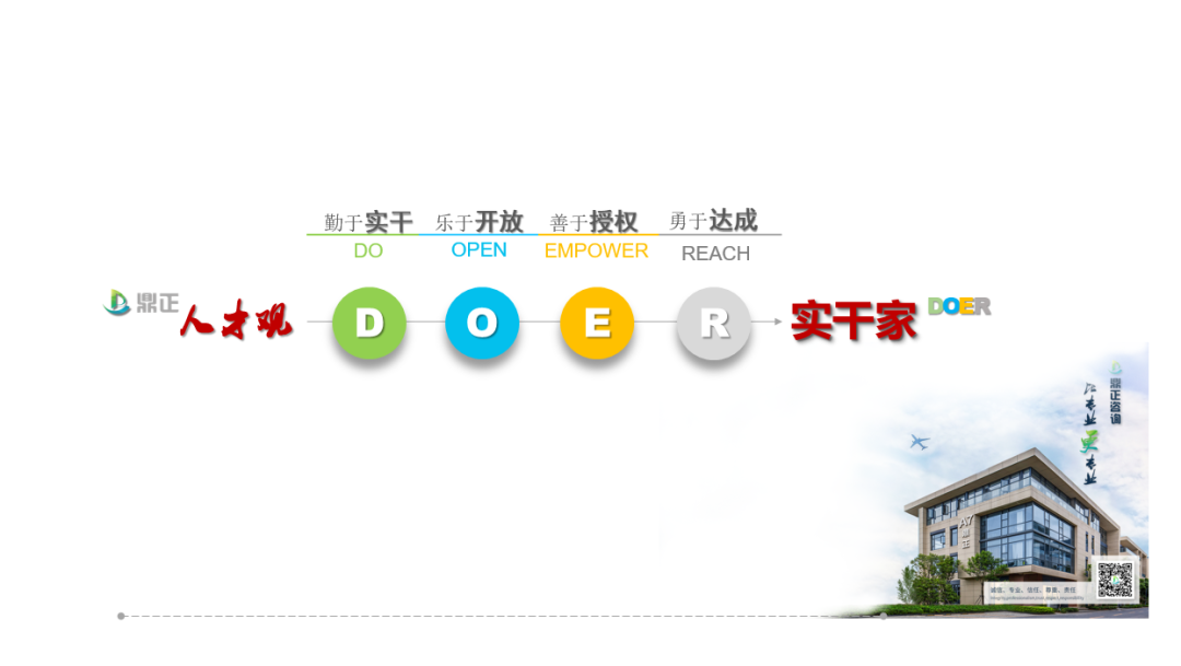 鼎正“DOER實干家”人才觀,是我們對人才認(rèn)知的基本價值觀,亦是人才發(fā)展成長的路徑,它能具體化指導(dǎo)同事們在工作中“對于自己、對于他人、對于團(tuán)隊、對于上級”分別能做些什么、該如何去做,從而調(diào)動和培養(yǎng)同事們發(fā)展的內(nèi)驅(qū)力和工作的協(xié)同性。