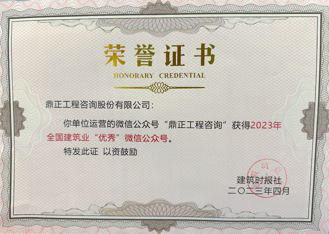 4月20日,由建筑時報主辦的2023年建筑業(yè)微信公眾號運維經(jīng)驗交流研討會暨全國建筑業(yè)優(yōu)秀公眾號頒獎典禮在廣西南寧舉辦。鼎正官方微信公眾號“鼎正工程咨詢”再度榮獲“全國建筑業(yè)優(yōu)秀微信公眾號”榮譽稱號。