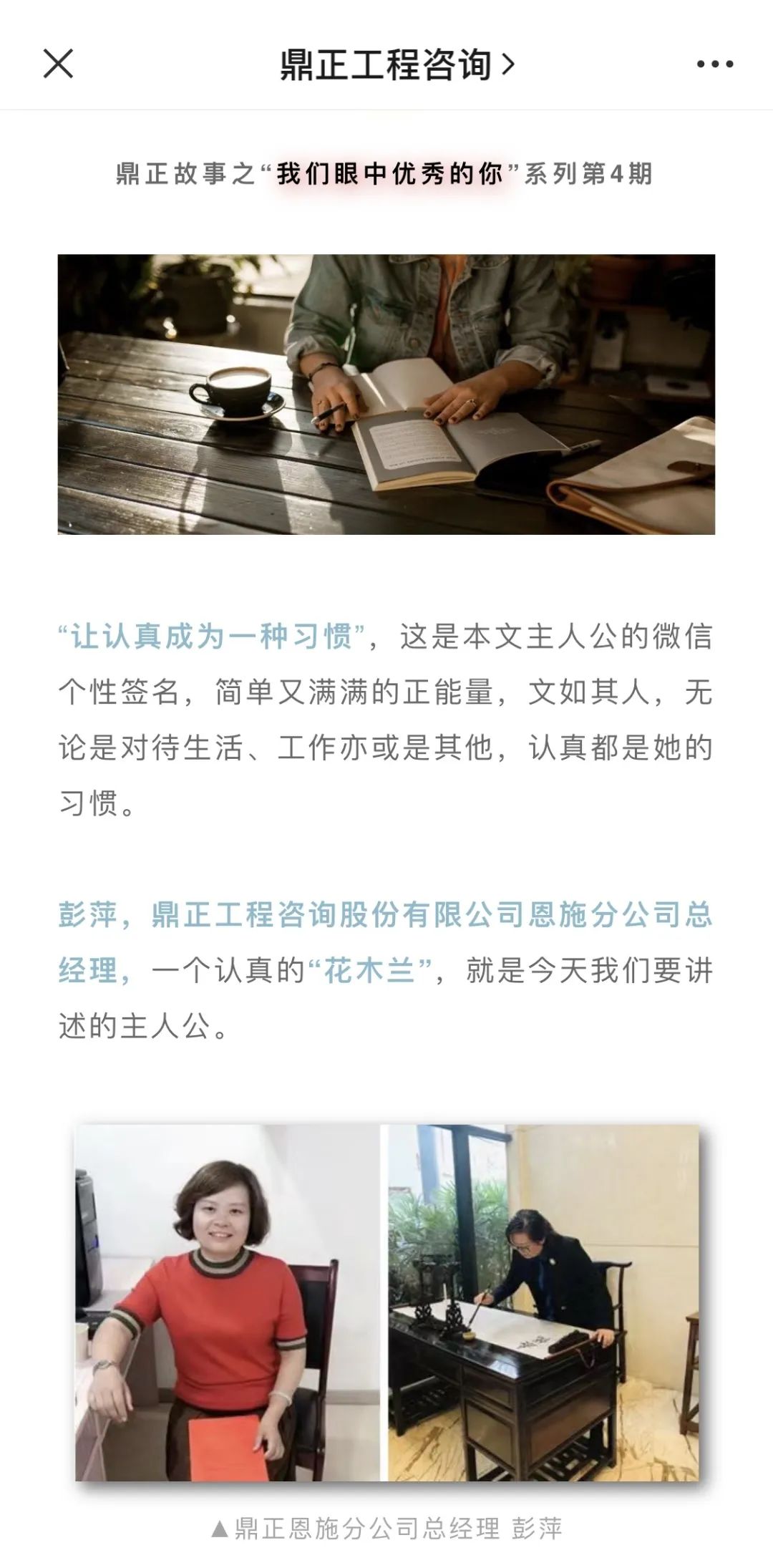 “鼎正工程咨詢”微信公眾號,既是公司品牌傳播的窗口,也是同事們互動交流的平臺。從2020年起,微信公眾號便相繼推出了“我們眼中優(yōu)秀的你”、“鼎正故事”、“榜樣人物”、“鼎正人物”等人文宣傳板塊,通過深度挖掘工程師的成長故事,全方位展示鼎正人的企業(yè)文化,為讀者奉上一道道關于奮斗的精神大餐。