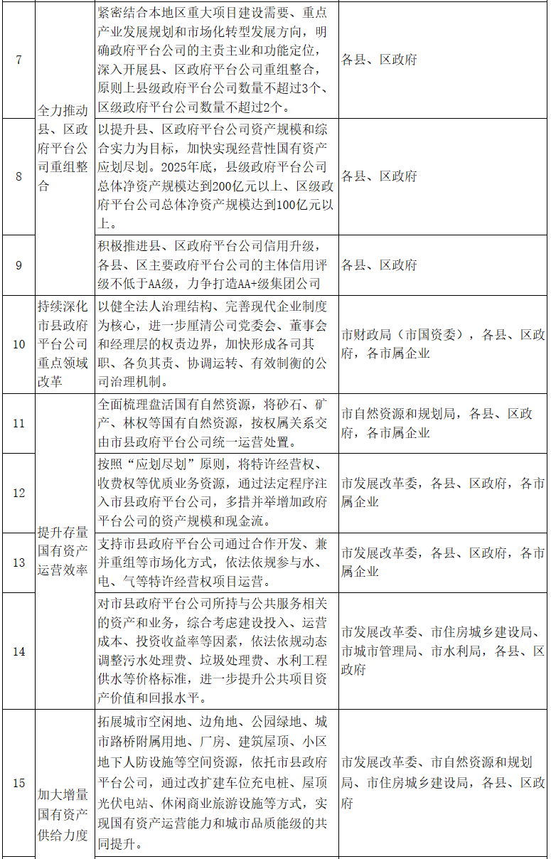 2.全力推動(dòng)縣、區(qū)政府平臺(tái)公司重組整合。各縣、區(qū)政府(市高新區(qū)管委會(huì)、市經(jīng)開(kāi)區(qū)管委會(huì),下同)要緊密結(jié)合本地區(qū)重大項(xiàng)目建設(shè)需要、重點(diǎn)產(chǎn)業(yè)發(fā)展規(guī)劃和市場(chǎng)化轉(zhuǎn)型發(fā)展方向,明確政府平臺(tái)公司的主責(zé)主業(yè)和功能定位,深入開(kāi)展縣、區(qū)政府平臺(tái)公司重組整合,充分發(fā)揮資源集聚優(yōu)勢(shì)。原則上縣級(jí)政府平臺(tái)公司數(shù)量不超過(guò)3個(gè)、區(qū)級(jí)政府平臺(tái)公司數(shù)量不超過(guò)2個(gè)。以提升縣、區(qū)政府平臺(tái)公司資產(chǎn)規(guī)模和綜合實(shí)力為目標(biāo),加快實(shí)現(xiàn)經(jīng)營(yíng)性國(guó)有資產(chǎn)應(yīng)劃盡劃。2025年底,縣級(jí)政府平臺(tái)公司總體凈資產(chǎn)規(guī)模達(dá)到200億元以上、區(qū)級(jí)政府平臺(tái)公司總體凈資產(chǎn)規(guī)模達(dá)到100億元以上。積極推進(jìn)縣、區(qū)政府平臺(tái)公司信用升級(jí),各縣、區(qū)主要政府平臺(tái)公司的主體信用評(píng)級(jí)不低于AA級(jí),力爭(zhēng)打造AA+級(jí)集團(tuán)公司。(責(zé)任單位:各縣、區(qū)政府)