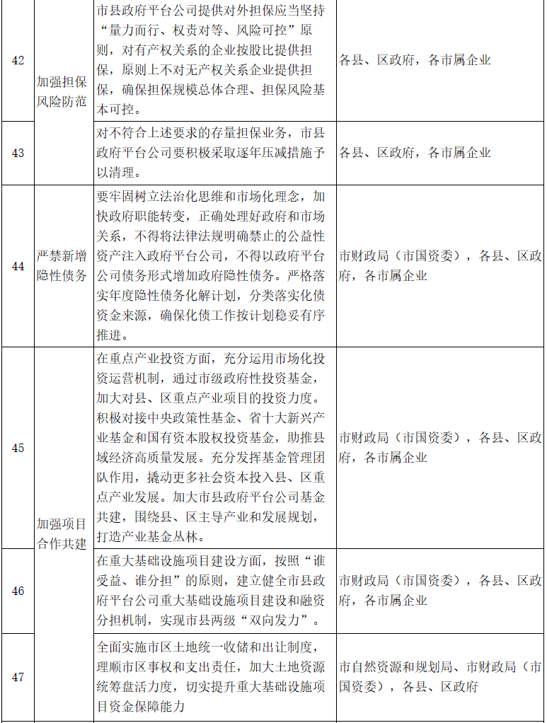 16.嚴(yán)禁新增隱性債務(wù)。要牢固樹(shù)立法治化思維和市場(chǎng)化理念,加快政府職能轉(zhuǎn)變,正確處理好政府和市場(chǎng)關(guān)系。不得將法律法規(guī)明確禁止的公益性資產(chǎn)注入政府平臺(tái)公司,不得以政府平臺(tái)公司債務(wù)形式增加政府隱性債務(wù)。嚴(yán)格落實(shí)年度隱性債務(wù)化解計(jì)劃,分類(lèi)落實(shí)化債資金來(lái)源,確保化債工作按計(jì)劃穩(wěn)妥有序推進(jìn)。〔責(zé)任單位:市財(cái)政局(市國(guó)資委),各縣、區(qū)政府,各市屬企業(yè)〕