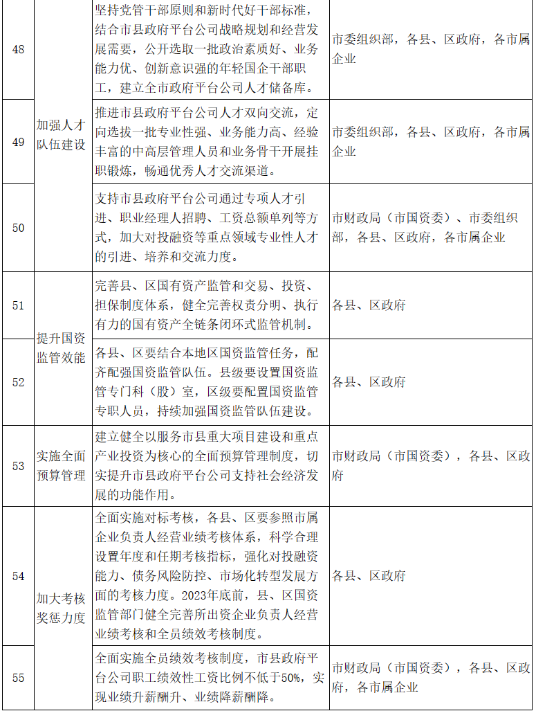 18.加強(qiáng)人才隊(duì)伍建設(shè)。堅(jiān)持黨管干部原則和新時(shí)代好干部標(biāo)準(zhǔn),結(jié)合市縣政府平臺(tái)公司戰(zhàn)略規(guī)劃和經(jīng)營(yíng)發(fā)展需要,公開(kāi)選取一批政治素質(zhì)好、業(yè)務(wù)能力優(yōu)、創(chuàng)新意識(shí)強(qiáng)的年輕國(guó)企干部職工,建立全市政府平臺(tái)公司人才儲(chǔ)備庫(kù)。推進(jìn)市縣政府平臺(tái)公司人才雙向交流,定向選拔一批專(zhuān)業(yè)性強(qiáng)、業(yè)務(wù)能力高、經(jīng)驗(yàn)豐富的中高層管理人員和業(yè)務(wù)骨干開(kāi)展掛職鍛煉,暢通優(yōu)秀人才交流渠道。支持市縣政府平臺(tái)公司通過(guò)專(zhuān)項(xiàng)人才引進(jìn)、職業(yè)經(jīng)理人招聘、工資總額單列等方式,加大對(duì)投融資等重點(diǎn)領(lǐng)域?qū)I(yè)性人才的引進(jìn)、培養(yǎng)和交流力度?!藏?zé)任單位:市委組織部、市財(cái)政局(市國(guó)資委),各縣、區(qū)政府,各市屬企業(yè)〕