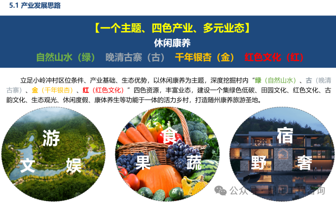 其中,雙河村通過發(fā)揮特色農業(yè)產業(yè)優(yōu)勢建設農業(yè)品牌,延伸農業(yè)加工產業(yè)鏈開啟創(chuàng)收新征程,積極發(fā)展鄉(xiāng)村休閑業(yè)打造詩意田園水鄉(xiāng),主要打造田園綜合體、濱河休閑體驗,拓展農業(yè)休閑旅游業(yè)態(tài)。泉水寺村重點結合國家級專用汽車和應急裝備檢測研發(fā)基地的建設基礎,構建以產業(yè)基地配套服務為主導,以生態(tài)種養(yǎng)、休閑農業(yè)為特色的產業(yè)體系。小嶺沖村重點整合“綠(自然山水)、古(晚清古寨)、金(千年銀杏)、紅(紅色文化)”四色資源,構建“綠+古+金+紅”四色產業(yè),打造品質活力鄉(xiāng)村旅游。九口堰村重點以豐富的紅色文化、自然資源為基礎,以紅色文化體驗為主導產業(yè),以文化帶動旅游,拓展紅色體驗、康養(yǎng)度假等產業(yè),打造全國紅色教育示范基地。