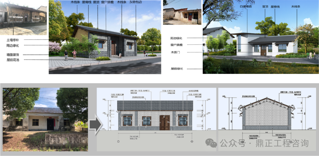 在建筑美化方面,通過建筑整體色彩協(xié)調、立面美化、增加裝飾、宅前屋后綠化等措施,實現(xiàn)對建筑的整改。其中對于歷史建筑風貌整治,要在不改變歷史建筑原狀的原則下,對民居進行部分修繕。同時整治歷史建筑的周圍環(huán)境,提升整體環(huán)境質量。
