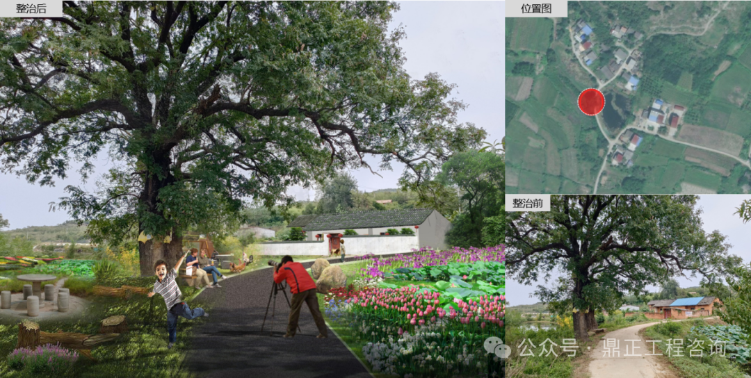 九口堰村入口空間,通過清理道路臟亂雜物,保留并完善修復破損路面;清理道路兩側雜草,梳理林下空間,沿線可播撒草籽,營造整齊干凈的鄉(xiāng)野景觀;結合九口堰村特色的古銀杏資源、香菇產業(yè)以及地方特色,于村口增設景墻,形成村莊入口標志;路邊環(huán)境梳理,通過木樁作為空間分界物,植栽時令花卉,作為背景點綴。