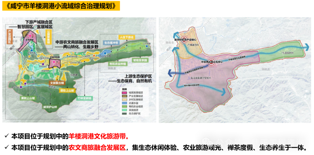 堅(jiān)持下位規(guī)劃服從上位規(guī)劃、下級規(guī)劃服務(wù)上級規(guī)劃,形成流域治理“一盤棋”。落實(shí)上位規(guī)劃對本項(xiàng)目的定位、功能、治理重點(diǎn)等的相關(guān)要求,找準(zhǔn)自身工作的側(cè)重點(diǎn)以及與全局工作的結(jié)合點(diǎn),才能保證設(shè)計(jì)“不偏題”。以本項(xiàng)目為例,上位規(guī)劃將羊樓洞港小流域劃分為三個治理區(qū),本項(xiàng)目位于農(nóng)文商旅融合發(fā)展區(qū)和羊樓洞港文化旅游帶,因此本項(xiàng)目不僅要關(guān)注到水生態(tài)、水環(huán)境的修復(fù)提升,還要考慮流域生態(tài)價值的轉(zhuǎn)化及對旅游產(chǎn)業(yè)的推動,利用好流域內(nèi)的茶產(chǎn)業(yè)特色以及茶馬古鎮(zhèn)的歷史文化特色,實(shí)現(xiàn)生態(tài)美與產(chǎn)業(yè)綠深度融合。