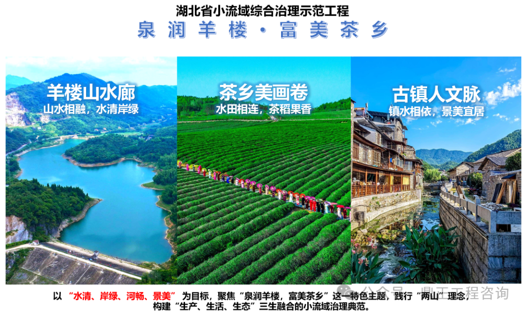 以本項(xiàng)目為例,設(shè)計(jì)提出以 “水清、岸綠、河暢、景美” 為目標(biāo),聚焦“泉潤羊樓,富美茶鄉(xiāng)”這一特色主題,踐行“兩山”理念,構(gòu)建“生產(chǎn)、生活、生態(tài)”三生融合的小流域治理典范。