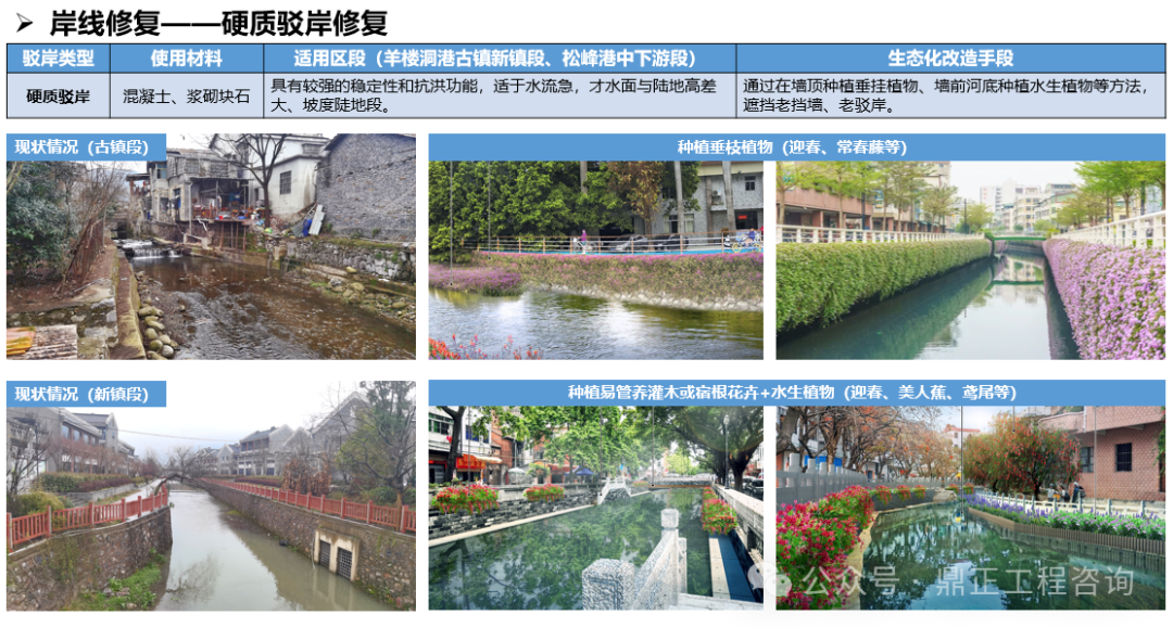 生態(tài)方面,打造“羊樓生態(tài)廊”,以水提質(zhì),修復(fù)流域生態(tài),即實(shí)施一批駁岸整治、水質(zhì)提升、生境構(gòu)建等河道治理措施進(jìn)行水岸共治。針對水生態(tài)的修復(fù),根據(jù)不同水體類型提出技術(shù)方式;對于岸線的修復(fù),又針對不同的駁岸類型提出適用的整治措施。