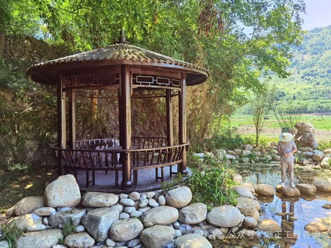 水景觀水文化打造:通過深挖相公泉?dú)v史文化內(nèi)涵,進(jìn)行本地印象提煉?!跋喙币辉~在古代,是妻子對丈夫的稱呼,也是君子、生員(秀才、相公)、宰相的另一種叫法。君子愛茶,沏茶品茗,修煉品性,以茶可雅志,茶是象征著塵世的純潔。設(shè)計(jì)從自然山水出發(fā),落位于閑情逸致設(shè)計(jì)基調(diào),泉眼處采用題字景石配上一棵姿態(tài)旖旎的紅豆,視線端頭一幅竹影錦鯉、花木跌水的畫面映入眼簾,兩側(cè)的樹木林立,開合有致,整個節(jié)點(diǎn)的中心是一座圓頂茶亭,在亭中,一壺清茶問道,仿佛拉近了古今往事,也增加了場地的記憶,呈現(xiàn)出 “千年古樹頻招手,萬年清泉溢清香”的意境。