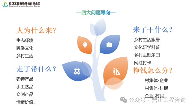 圍繞人為什么來、來了干什么、走了帶什么、掙錢怎么分四大問題去思考鄉(xiāng)村該怎么運營,去明確鄉(xiāng)村的主題定位、發(fā)展方向、核心產品、運營方式,更好地推進鄉(xiāng)村運營。