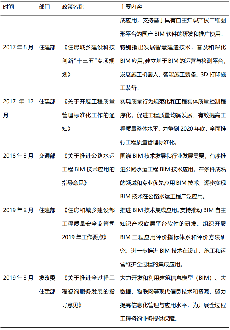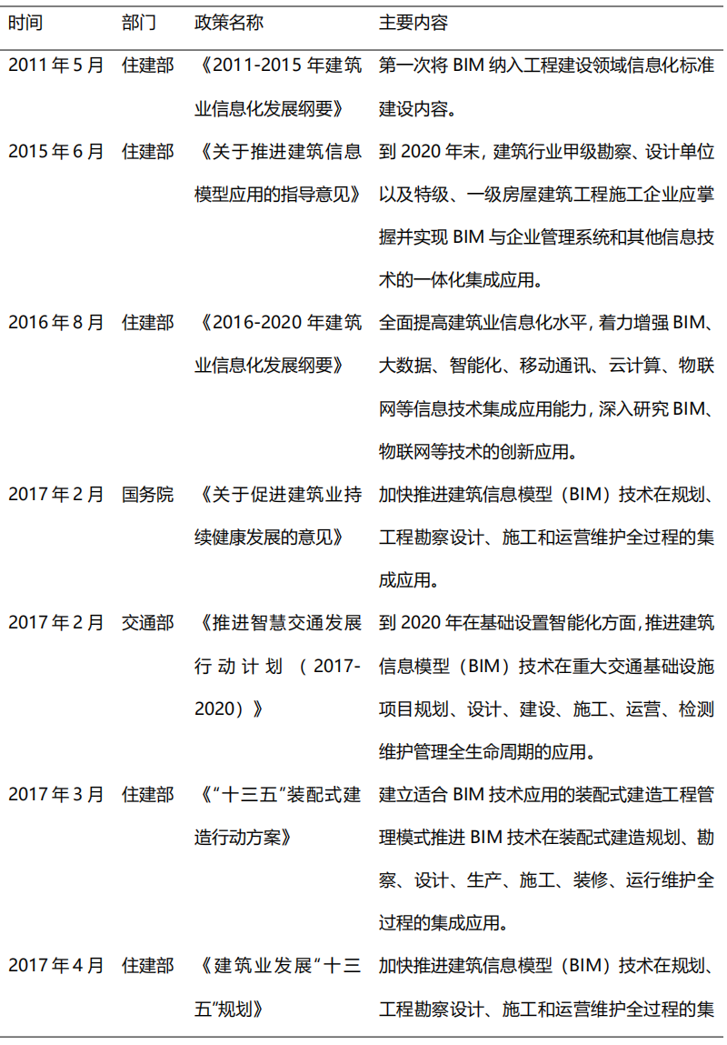 隨著社會的發(fā)展,行業(yè)需求的轉(zhuǎn)變,加之國家和各地政府的扶持,建筑行業(yè)信息化、數(shù)據(jù)化、智能化趨勢不可逆轉(zhuǎn)。BIM勢必全面應(yīng)用到規(guī)劃、勘察、設(shè)計(jì)、施工和運(yùn)營維護(hù)中來,實(shí)現(xiàn)工程建設(shè)項(xiàng)目全生命周期數(shù)據(jù)共享和信息化管理。近年來,國務(wù)院、住建部等相關(guān)單位,頻繁頒發(fā)鼓勵和要求應(yīng)用BIM技術(shù)的指導(dǎo)意見,表1列出了國家層面的重要文件。