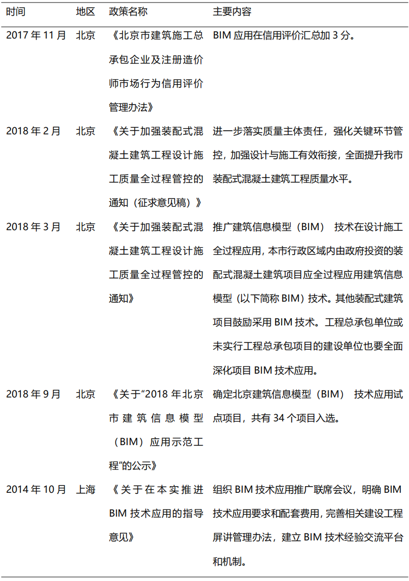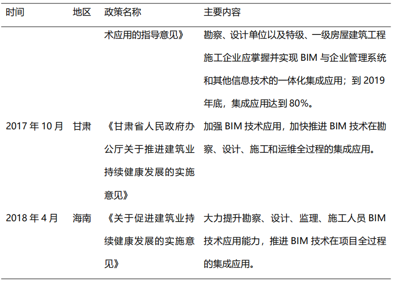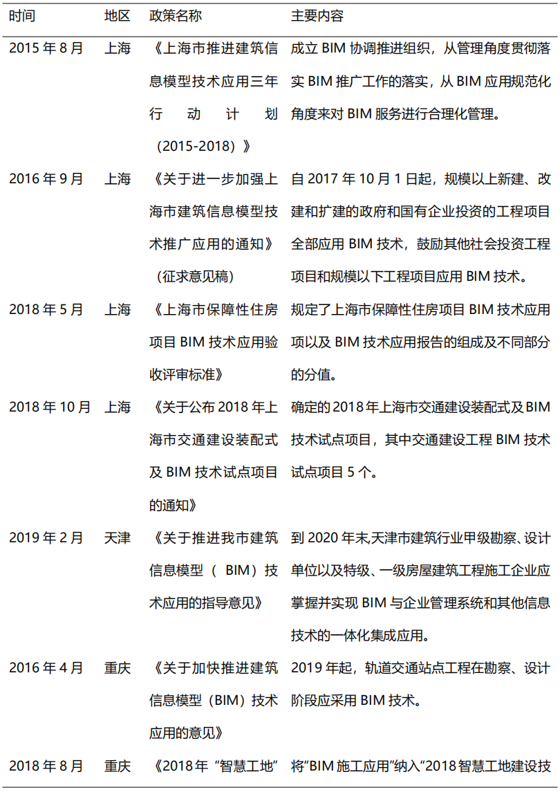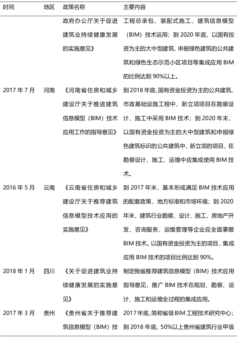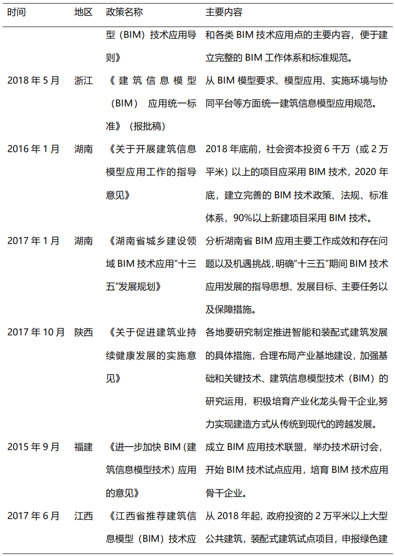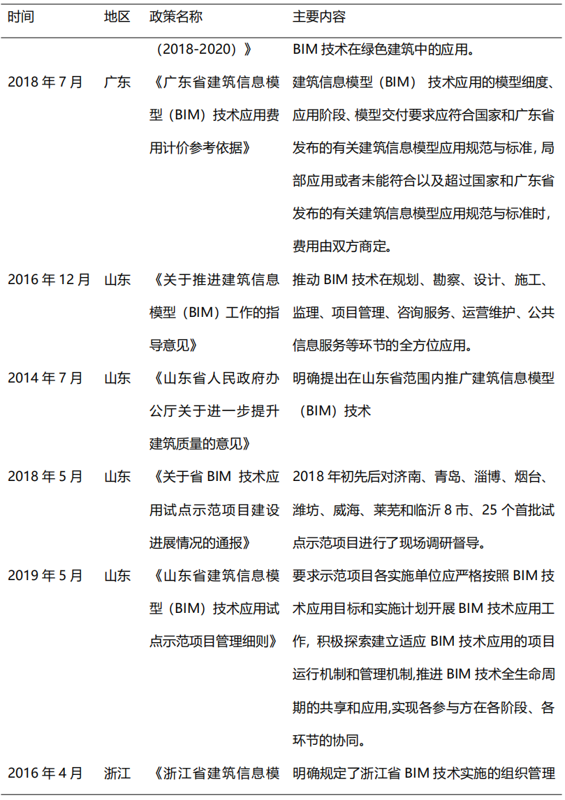 從2014年開始,在住建部的大力推動下,各省市政策相繼出臺BIM推廣應(yīng)用文件,到目前我國已初步形成BIM技術(shù)應(yīng)用標(biāo)準(zhǔn)和政策體系,為BIM的快速發(fā)展奠定了堅(jiān)實(shí)的基礎(chǔ)。2017年,貴州、江西、河南等省市正式出臺BIM推廣意見,明確提出在省級范圍內(nèi)提出推廣BIM技術(shù)應(yīng)用。2018-2019年,各地政府對于BIM技術(shù)的重視程度不減,重慶、北京、吉林、深圳等多地政策出臺指導(dǎo)意見,旨在推動BIM技術(shù)進(jìn)一步應(yīng)用普及。隨著我國出臺BIM推廣意見的省市數(shù)量逐漸增多,全國BIM技術(shù)應(yīng)用推廣的范圍更加廣泛。表2列舉了部分重要地方鼓勵政策。