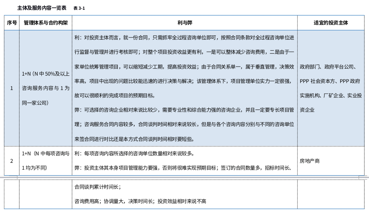 不同的投資主體所需的服務(wù)內(nèi)容和管理模式不一樣,就會導(dǎo)致項目管理體系上和合約構(gòu)架上不一樣,以下通過表格闡述不同的管理體系和合約構(gòu)架的利與弊及適宜的投資主體(本文倡導(dǎo)的全過程咨詢以項目管理為主線,用1表示,前期咨詢、監(jiān)理、造價、招標(biāo)代理、勘察設(shè)計管理等用N表示):