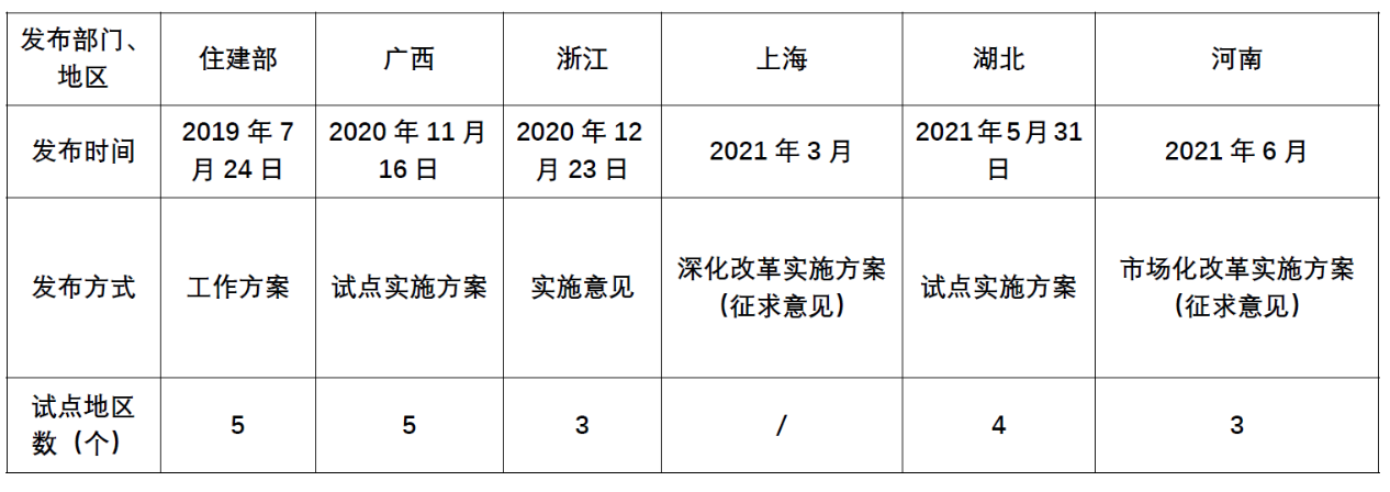 2020年7月24日,住房和城鄉(xiāng)建部辦公廳印發(fā)關(guān)于工程造價(jià)改革工作方案的通知(建辦標(biāo)〔2020〕38號(hào),以下簡稱38號(hào)文),通知決定在北京市、浙江省、湖北省、廣東省、廣西壯族自治區(qū)等五個(gè)地區(qū)開展方案試點(diǎn)工作。截至本稿起筆日(2021.6.3),廣西、浙江和湖北等三個(gè)試點(diǎn)地區(qū)相繼發(fā)布有關(guān)方案通知,北京、廣東尚未見官方相關(guān)信息。五個(gè)試點(diǎn)城市外,上海、河南等地的方案在征求意見中。