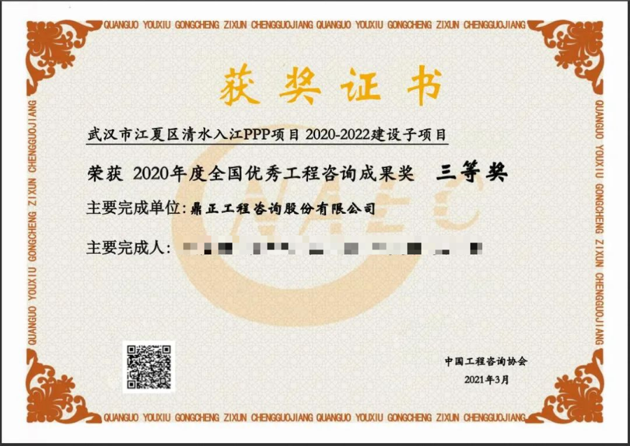 2021年3月5日,中國(guó)工程咨詢(xún)協(xié)會(huì)公布了“2020年度全國(guó)優(yōu)秀工程咨詢(xún)成果獎(jiǎng)”獲獎(jiǎng)項(xiàng)目名單,鼎正咨詢(xún)繼2019年全咨項(xiàng)目榮獲全國(guó)優(yōu)秀工程咨詢(xún)成果獎(jiǎng)后,又一PPP咨詢(xún)項(xiàng)目——由鼎正咨詢(xún)獨(dú)立編制完成的“武漢市江夏區(qū)清水入江PPP項(xiàng)目 2020-2022建設(shè)子項(xiàng)目”實(shí)施方案再度榮獲全國(guó)優(yōu)秀工程咨詢(xún)成果三等獎(jiǎng)!