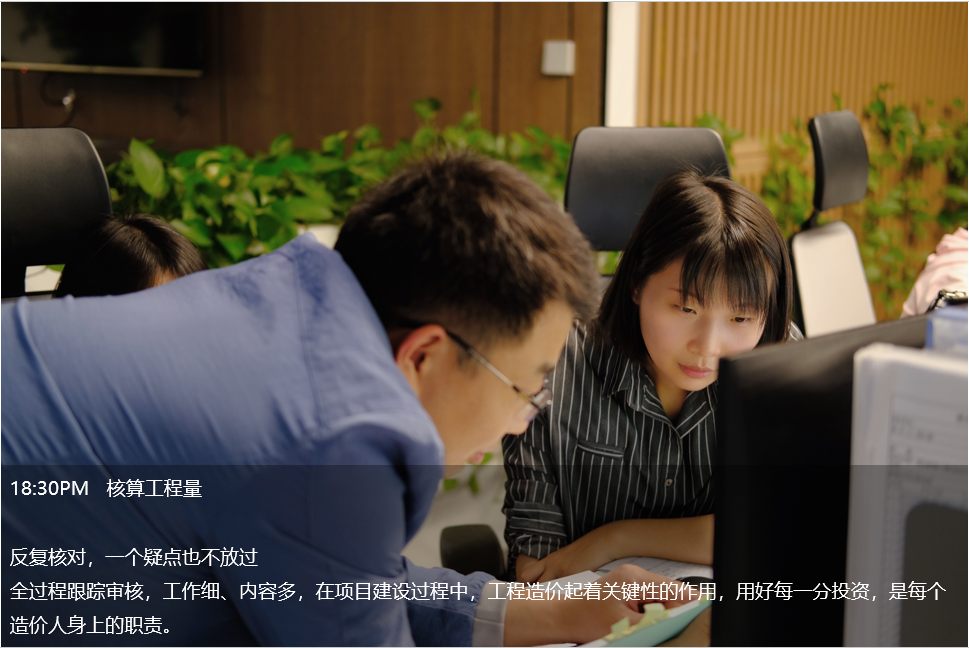 晚上7點(diǎn),造價(jià)部同事還在計(jì)算工程量。內(nèi)墻工程量是不是漏算了?混凝土類型是不是用錯(cuò)了?他們邊檢查邊計(jì)算,用嚴(yán)謹(jǐn)?shù)墓ぷ鲬B(tài)度,扎實(shí)的專業(yè)技能,細(xì)致的服務(wù)理念,一次又一次贏得客戶的信賴。