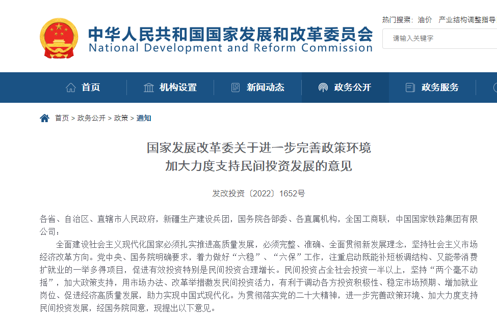 全面建設社會主義現(xiàn)代化國家必須扎實推進高質(zhì)量發(fā)展,必須完整、準確、全面貫徹新發(fā)展理念,堅持社會主義市場經(jīng)濟改革方向。黨中央、國務院明確要求,著力做好“六穩(wěn)”、“六?!惫ぷ鳎⒅貑蛹饶苎a短板調(diào)結(jié)構(gòu)、又能帶消費擴就業(yè)的一舉多得項目,促進有效投資特別是民間投資合理增長。民間投資占全社會投資一半以上,堅持“兩個毫不動搖”,加大政策支持,用市場辦法、改革舉措激發(fā)民間投資活力,有利于調(diào)動各方投資積極性、穩(wěn)定市場預期、增加就業(yè)崗位、促進經(jīng)濟高質(zhì)量發(fā)展,助力實現(xiàn)中國式現(xiàn)代化。為貫徹落實黨的二十大精神,進一步完善政策環(huán)境、加大力度支持民間投資發(fā)展,經(jīng)國務院同意,現(xiàn)提出以下意見。
