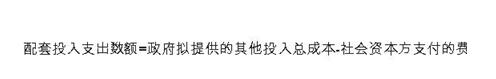 第二十二條 配套投入支出責(zé)任應(yīng)綜合考慮政府將提供的其他配套投入總成本和社會(huì)資本方為此支付的費(fèi)用。配套投入支出責(zé)任中的土地等實(shí)物投入或無(wú)形資產(chǎn)投入,應(yīng)依法進(jìn)行評(píng)估,合理確定價(jià)值。計(jì)算公式為: