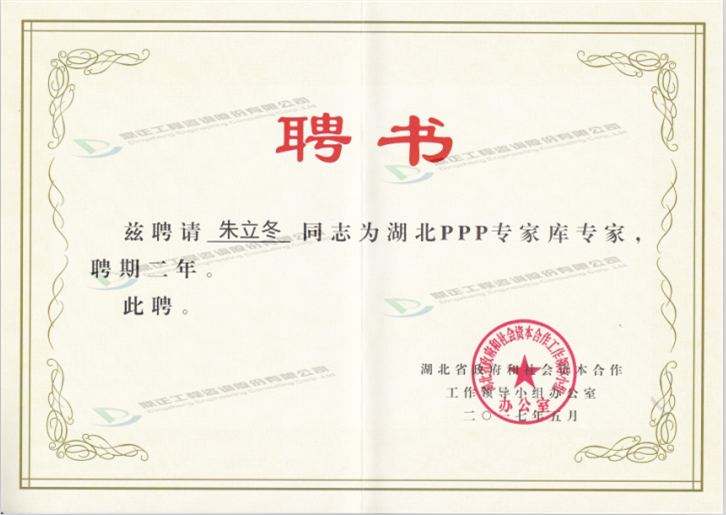 近日,湖北省政府和社會資本合作工作領(lǐng)導(dǎo)小組辦公室授予鼎正公司董事長王雁然先生、副總經(jīng)理兼技術(shù)總監(jiān)朱立冬教授為湖北省PPP專家?guī)鞂<?。此?/SPAN>,我司王雁然先生、朱立冬教授、張宏亮先生已入選湖北省財政廳PPP專家?guī)鞂<遥硗?,王雁然先生還被崇陽縣人民政府聘為崇陽縣PPP項目專家顧問。