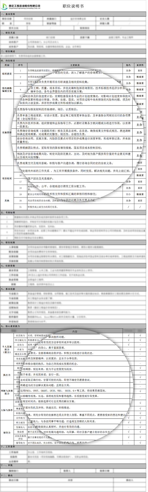 為優(yōu)化人才隊(duì)伍結(jié)構(gòu)及提高能力素質(zhì),鼎正人資部與造價(jià)咨詢事業(yè)部通過(guò)對(duì)項(xiàng)目經(jīng)理崗位職責(zé)進(jìn)行列舉和歸類,對(duì)工作流程、部門內(nèi)各職位間的職責(zé)分配進(jìn)行分析和規(guī)劃,共同編寫(xiě)了造價(jià)咨詢事業(yè)部項(xiàng)目經(jīng)理崗位說(shuō)明書(shū),以便項(xiàng)目經(jīng)理和準(zhǔn)項(xiàng)目經(jīng)理們?nèi)轿涣私夤ぷ髂繕?biāo)以及在個(gè)人能力素質(zhì)方面的差距,從而制定合理的學(xué)習(xí)計(jì)劃。